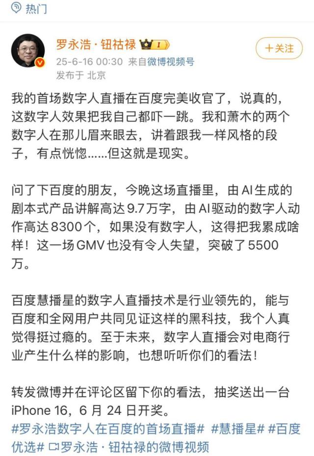 罗永浩过了一把" AI 瘾",百度优选的直播结束后,他连发了好几条跟数字人直播有关的动态,感叹数字人罗永浩的逼真程度。