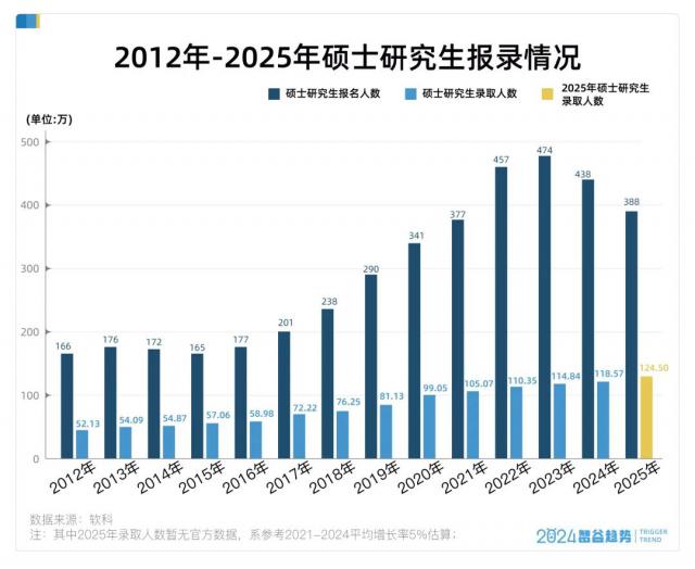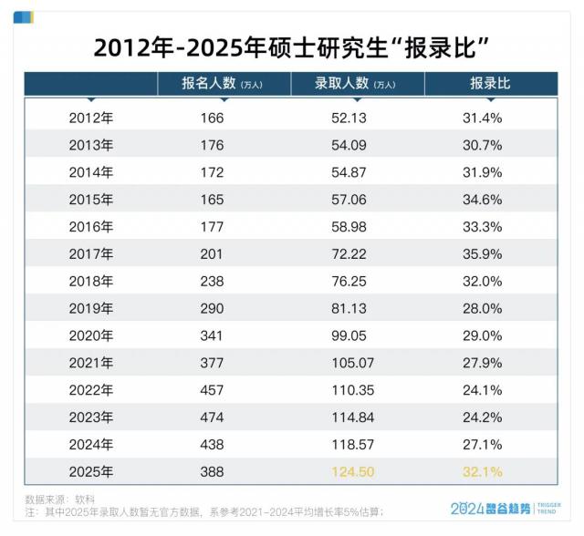 根据 2021-2024 年的录取人数平均增长率(5% 左右)估算,2025 年的录取人数将达到 124.5 万左右,报录比也将快速回升到 32%,回到过去 13 年来比较"容易"的时刻。