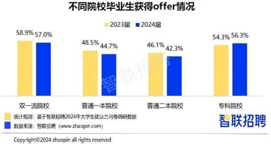 根据智联招聘 2024 年《大学生就业力调研报告》,国内研究生就业率首次被本科生反超——硕博毕业生 offer 获得率 44.4%,低于本科生的 45.4%,而大专生则达到 56.6%。